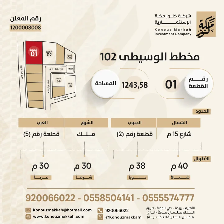 مجموعة من قطع الأراضي السكنية في مخطط معتمد شرق بريدة-حي الوسيطى شاملة وقريبة من كل الخدمات معلومات القطع: قطعة 1/ 1243م، شمالية قطعة 2/ 952م، غربية قطعة 4/ 410م، غربية قطعة 14/ 305م، شمالية شرقية قطعة 16 / 697م، شرقية غربية